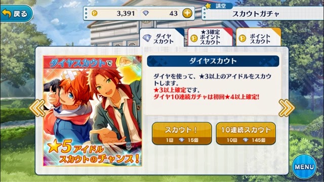 To get higher starred cards you need to scout. To scout tap on the icon of a map which will take you to the school grounds map. The orange button with images of cards and a door is the Scout Gacha. You have 3 options here: Diamond scout is using 15 diamonds for 1 card or 145 diamonds for 10 cards with best chance of getting 3-4 star cards, 10,000p(producer) point gacha is 3 star card and 100,000 for 10 3 star cards, and last is point scout using 100p for one card and 1,000 for 10 and these will mostly be 1-2 star cards.